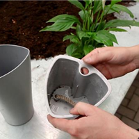 Bauen Sie Ihren Blumentopf mit Wasserspeicher nach Anleitung zusammen. Sollten die Abzugslöcher zu groß sein, so dass das Granulat durchfallen kann, legen Sie einfach ein paar Tonscherben darüber. Füllen Sie eine Schicht des Tongranulats ein.