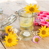 Die Materialliste für die Blumenseife ist überschaubar und auch die Herstellung ist kinderleicht. Seife sieden ist zwar eine aufwendige Angelegenheit, ist aber für die Herstellung der Blumenseife nicht erforderlich. Fertige Seifenrohmasse lässt sich im Handel kaufen und auf Glycerinbasis ist sie auch noch besonders gut für die Haut. Damit die Blüten auch hübsch zur Geltung kommen, sollte die Seifenrohmasse durchsichtig sein. Zuerst wird nur eine kleine Menge Seifenrohmasse geschmolzen und die Gießformen damit gefüllt, bis der Boden bedeckt ist. Dann können auch schon die Blüten mit dem Gesicht nach unten in die Förmchen gedrückt werden. Wenn die Seifenrohmasse etwas fest geworden ist, kann eine neue Portion geschmolzen werden. Dann werden die Gießförmchen bis an den Rand mit der neuen geschmolzenen Seifenrohmasse aufgefüllt. Wer mag, kann dann mit Aromaöl noch einen angenehmen Duft hinzugeben.