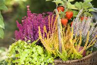 Damit der Kranz auch in die vorhandene Herbstdekoration passt, kommen jetzt noch die Pflanzen zum Einsatz. Die Besenheide knapp oberhalb der Wurzeln von der Pflanze abschneiden und mit Blumendraht am Kranz festbinden. Wenn das abwechselnd auf beiden Seiten gemacht wird, sieht der Krank am Ende schön symmetrisch aus. Um dem Kranz noch mehr Farbe zu verleihen, können zwischen den Heidezweigen noch Zweige von Olive, Eukalyptus oder Lorbeer festgebunden werden. Schleierkraut und Gräser eignen sich übrigens auch sehr gut für den Herbstkranz.